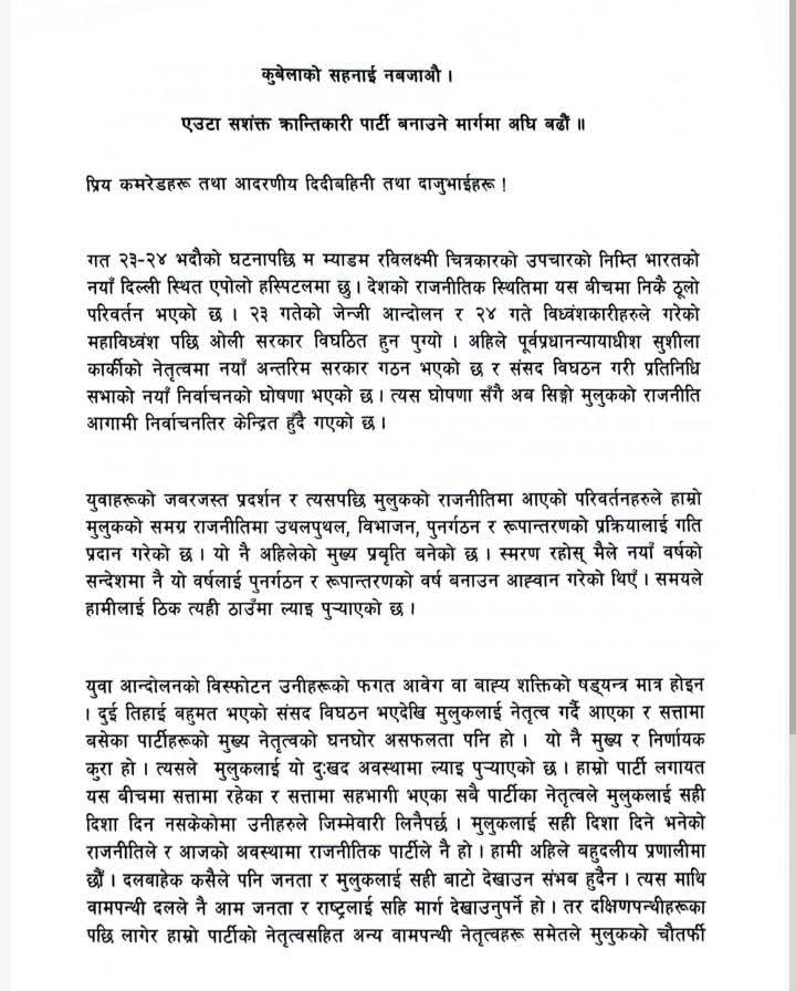 अन्त्यमा उनले सन्देशमा भनेका छन्, “कुबेलाको सहनाई बजाउन तिर कोही पनि नलागौं। सिङ्गो पार्टीलाई एकताबद्ध बनाएर पुनर्गठन र रूपान्तरणको ऐतिहासिक मागतिर अघि बढौं।”