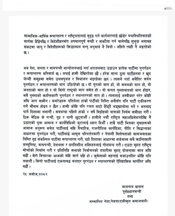 खनालले पार्टी भित्रका युवाहरूको आवाज सुनेर पार्टीलाई सहि वैचारिक, राजनीतिक कार्यदिशा, नीति र सिद्धान्तका आधारमा पुनर्गठन गर्नुपर्नेमा जोड दिएका छन्। उनले भनेका छन्, “पार्टीलाई आमूल परिवर्तनकारी र नेपाली विशेषताको समाजवादका निम्ति दृढ संकल्पित पार्टीमा रूपान्तरण गरौं। यही दिशामा सबै क्रान्तिकारी, कम्युनिष्ट, वामपन्थी, देशभक्त र प्रगतिशील शक्तिहरूलाई गोलबन्द गरौं। एउटा वृहत राष्ट्रिय मोर्चा निर्माण गरौं र आगामी प्रतिनिधिसभा निर्वाचनमा बृहत् योजनासहित अघि बढौं।”