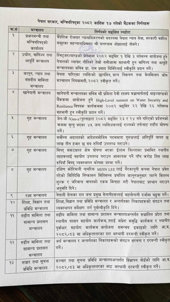 मन्त्रिपरिषद् बैठकका १३ निर्णयः