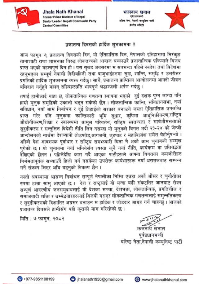 काठमाडौँ । पूर्वप्रधानमन्त्री तथा झलनाथ खनाल ले लोकतान्त्रिक गणतन्त्रको सुदृढीकरणका लागि आगामी निर्वाचनमा देशभक्त, लोकतान्त्रिक र प्रगतिशील शक्तिलाई विजयी गराउन आह्वान गरेका छन्।