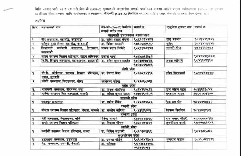 मन्त्रालयको निर्णयअनुसार घाइतेको उपचार र फलोअपलाई व्यवस्थित गर्न देशभर १६ अस्पतालमा डेडिकेटेड जेनजी क्लिनिक स्थापना गरिएको छ। यी क्लिनिकले उपचार, नियमित स्वास्थ्य परीक्षण र परामर्श सेवा निःशुल्क उपलब्ध गराउनेछन्। साथै, अस्पतालसम्म निःशुल्क आवतजावतको सुविधा र प्रत्येक क्लिनिकमा फोकल व्यक्ति तोकिएको छ।