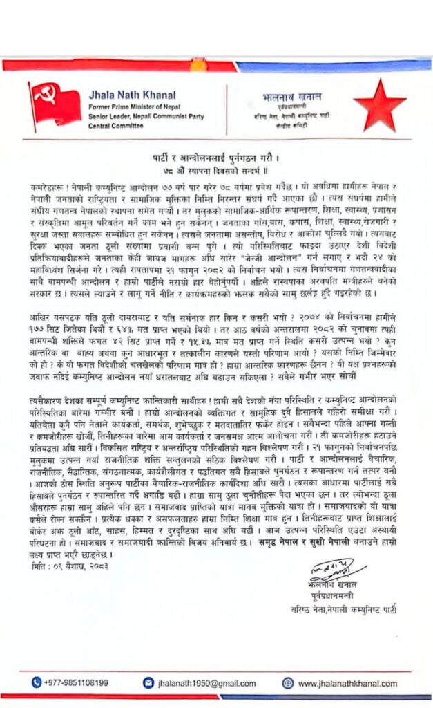 काठमाडौं । पूर्वप्रधानमन्त्री तथा नेपाली कम्युनिष्ट पार्टीका वरिष्ठ नेता झलनाथ खनालले नेपाली कम्युनिष्ट आन्दोलनको स्थापना दिवसको सन्दर्भमा पार्टी र आन्दोलनलाई पुनर्गठन गर्न आह्वान गरेका छन्।