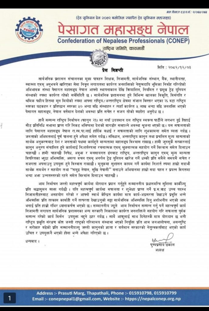 महासङ्घले हालै सम्पन्न प्रतिनिधिसभाको निर्वाचनमा लगभग दुई तिहाई नजिकको जनमत पाएको राष्ट्रिय स्वतन्त्र पार्टी (रास्वपा) लाई बधाई दिँदै सफल कार्यकालको शुभकामना व्यक्त गरेको छ । उसले जनताको मन जितेर काम गर्न पनि अब बन्ने नयाँ सरकारलाई आग्रह गरेको छ । महासंघले नयाँ बन्ने सरकारले भन्दै आएको ट्रेड युनियन खारेजीको विषयमा आपत्ति जनाएको छ ।